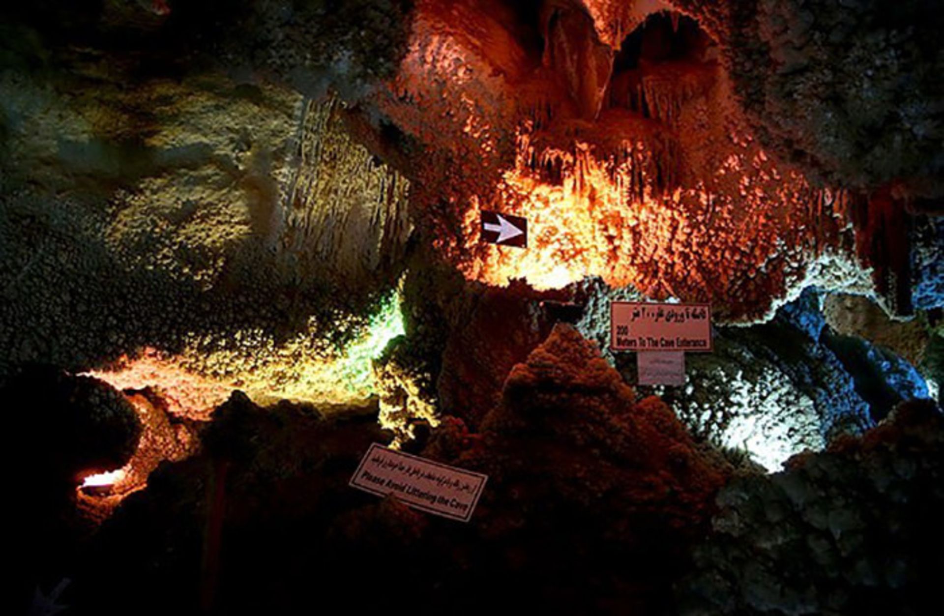 بافتها و قندیلهای بلورین غار به رنگ تیره درآمده و سقف غار پر از پیچ واپیچها و شکستگیهای گوناگون است. این غار تا عمق ۱۴ کیلومتر شناسایی و بیش از یک کیلومتر آن کفسازی شده است که با طی کردن ۴۷ پله میتوان به این عمق دست یافت.