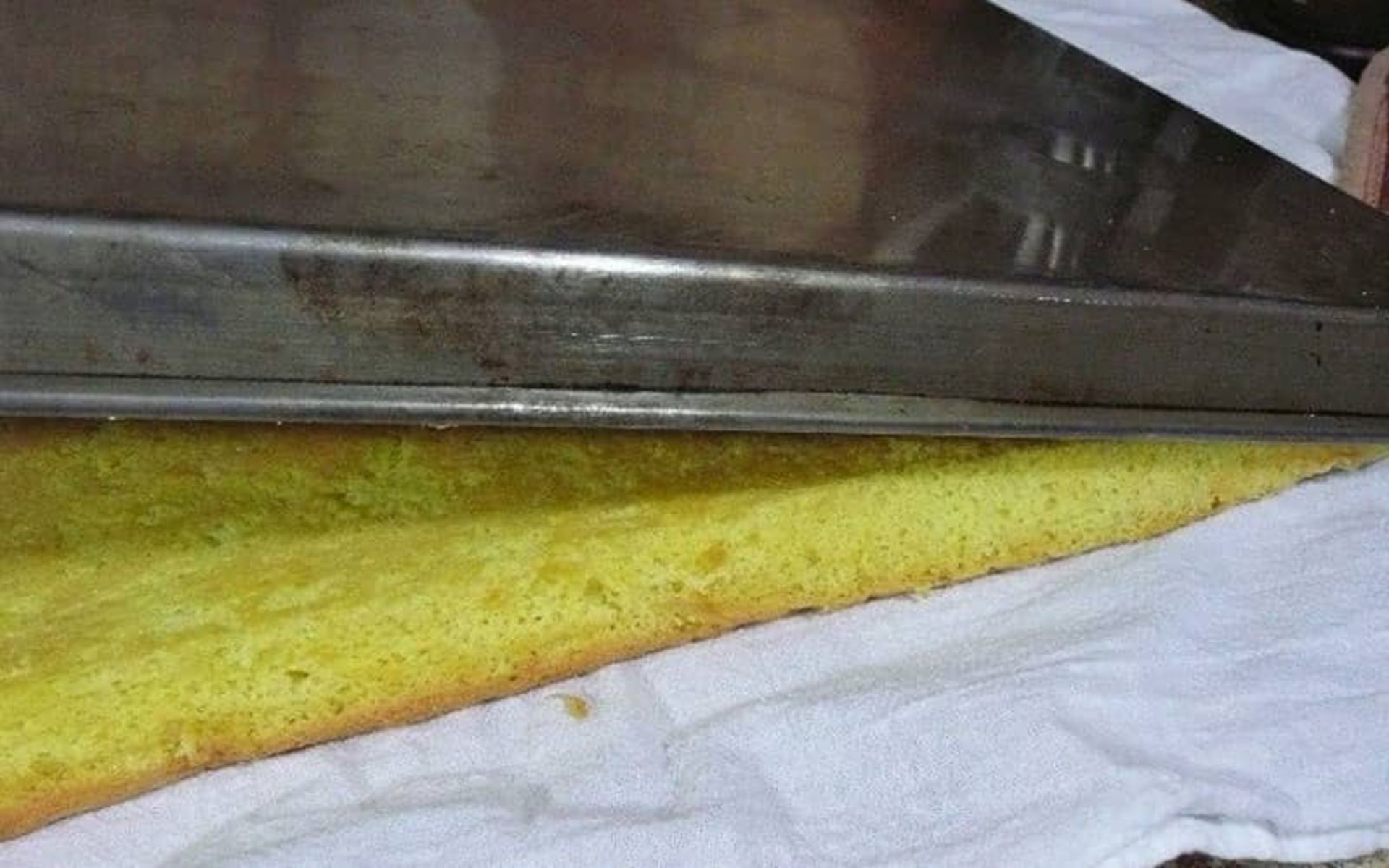 ۶. کف قالب ۳۰ در ۴۰ سانتیمتری را کاغذ روغنی بیندازید و مایه رولت را طوری کف قالب پهن کنید که بهشکل یکدست در تمام سطح قالب پخش شود.