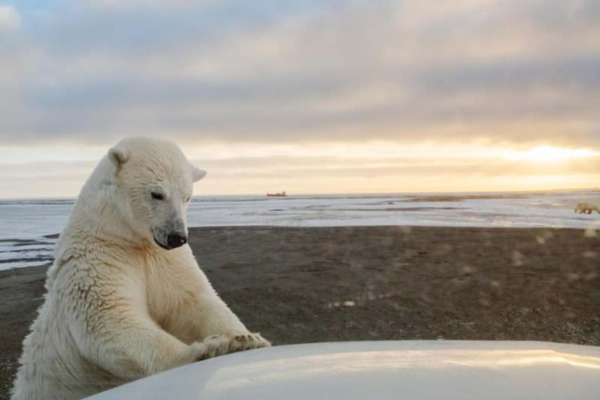 یک خرس قطبی در حال بررسی یک ماشین در نزدیکی کاکتویک آلاسکا است. آب شدن یخ‌های سطح دریا، خرس‌های بیشتری را به‌سمت زمین‌ها در جست‌وجوی غذا کشانده است. ذوب شدن و جاری شدن سردخانه‌های یخی، آلاسکایی‌ها را مجبور کرده است تا گوشت و ماهی را بیرون نگه دارند.