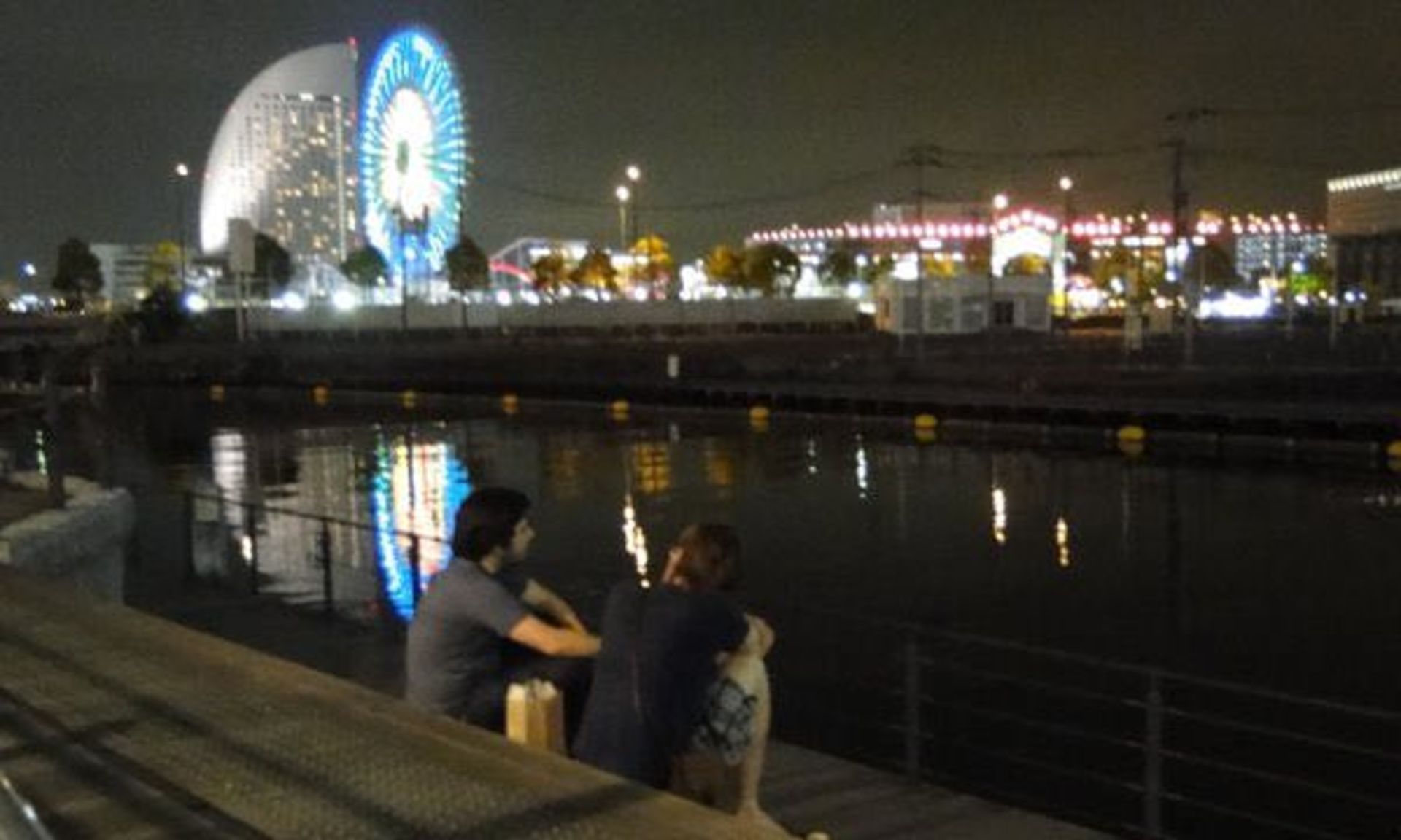 نئونی که آب و چرخوفلک یوکوهاما را نمایان میکند در پسزمینه قرار دارد. ما هر دو غرق در صحبت شده بودیم و همزمان به آبها خیره نگاه میکردیم.